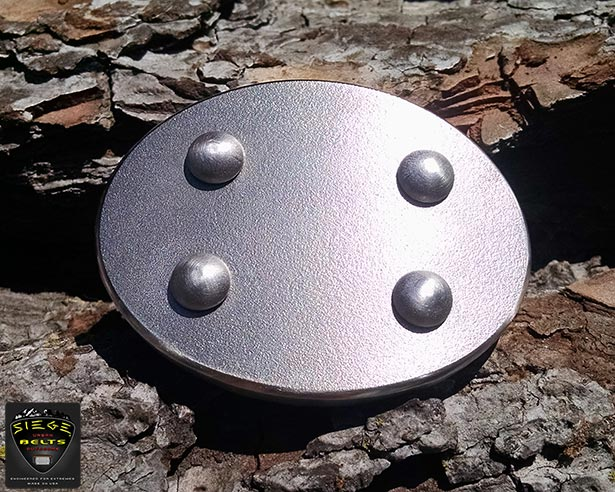 SIEGE trademark FRENZY belt, Gray Man edition: 6 ounce solid stainless steel OVAL buckle with our durable scratch-resistant brushed Gray Man finish bolted to custom 1.5″ high-density ballistic nylon in the length you choose, with either Black or Brown facing out.