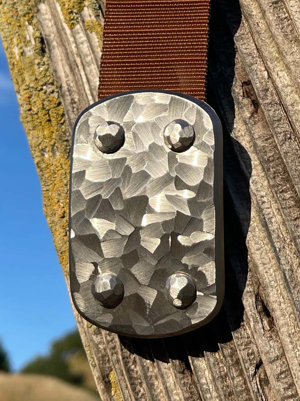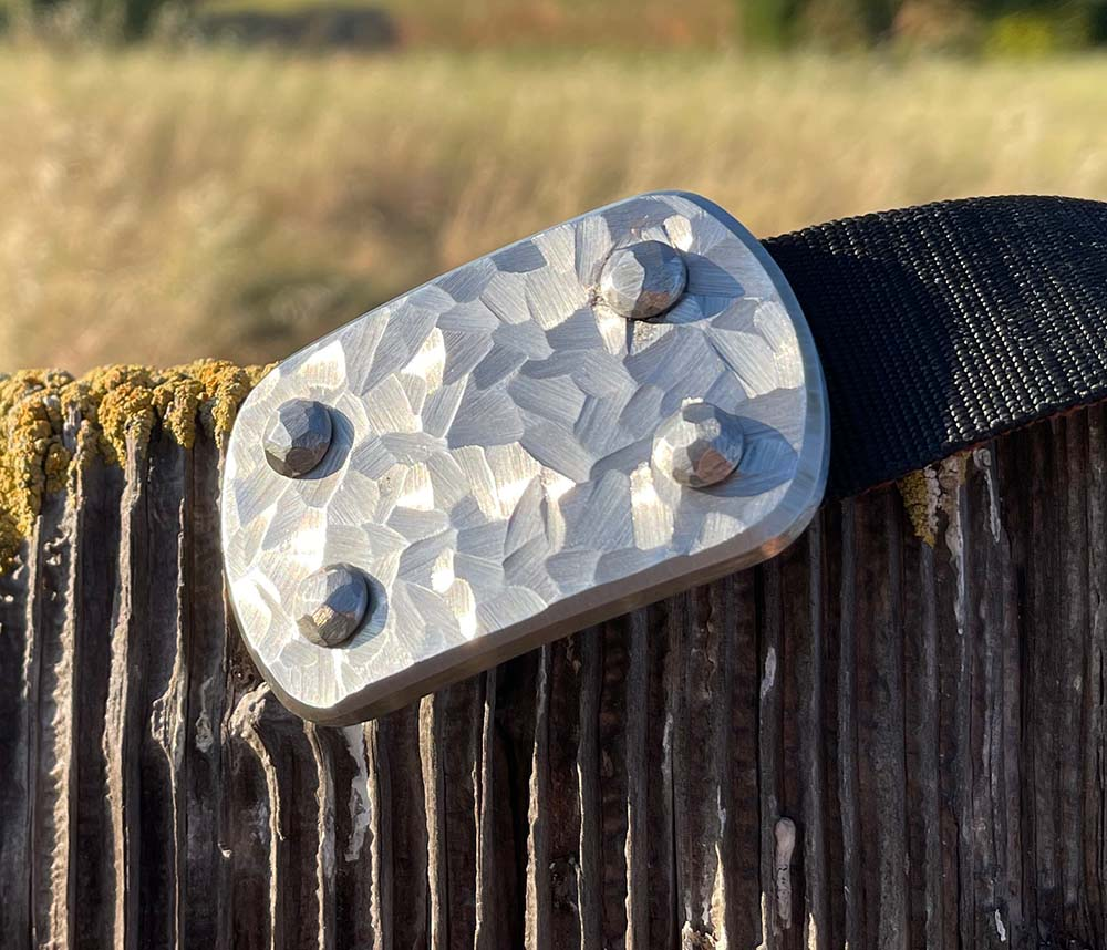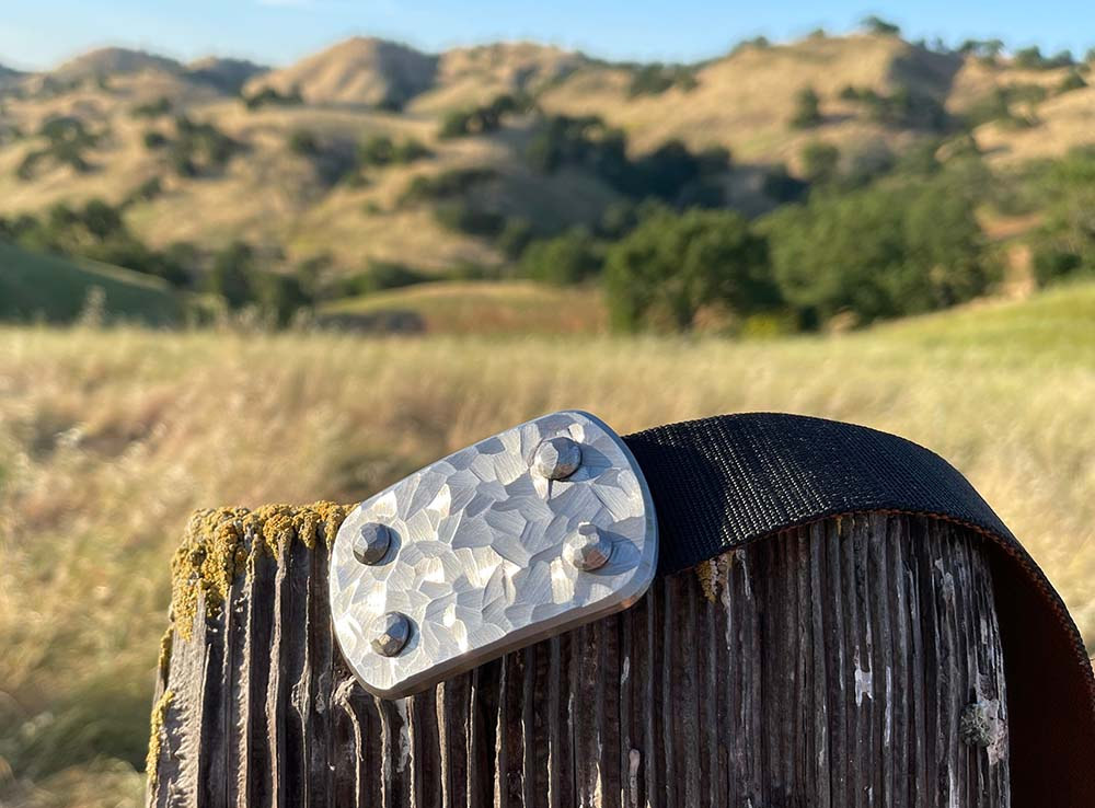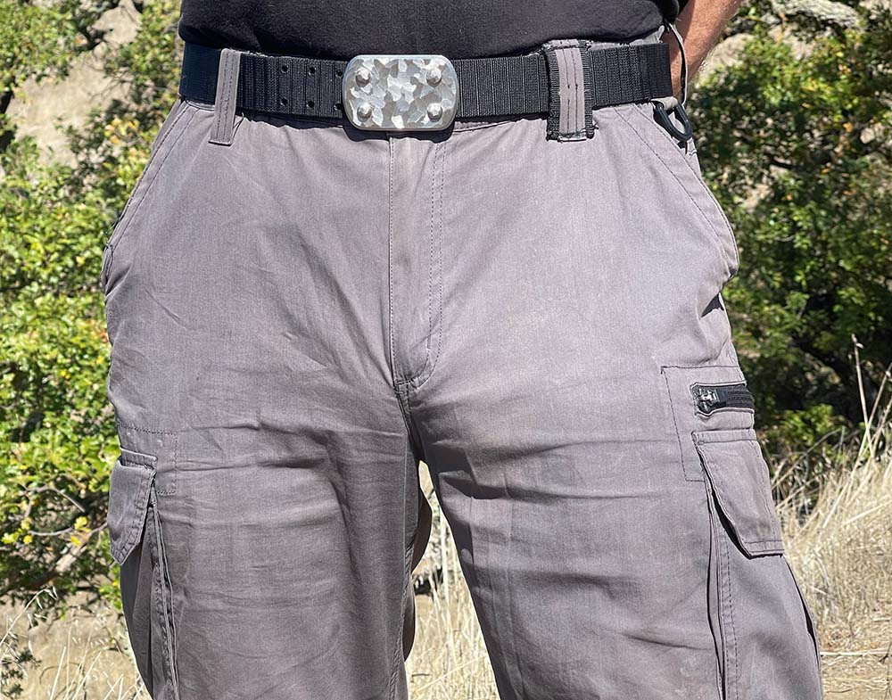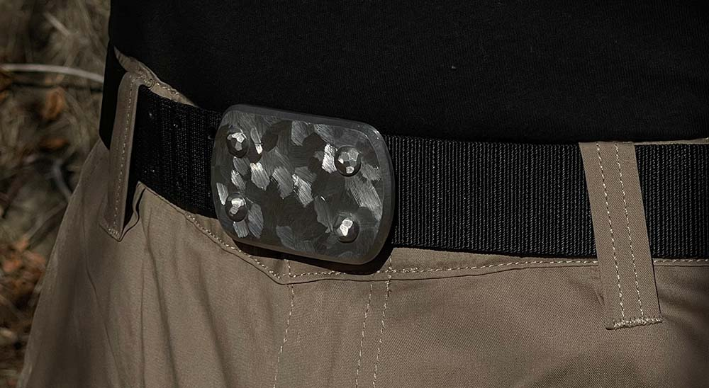 SIEGE Skukuza belt: 6 ounce solid stainless steel LARGE buckle with a dimensional hand-sculpted finish bolted to custom 1.5″ high-density ballistic Nylon in the length you require, with either Black or Brown facing out.