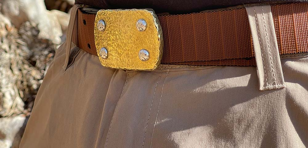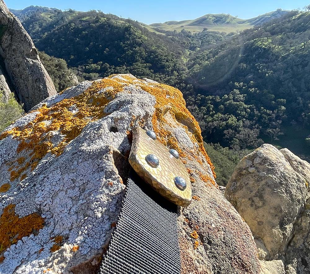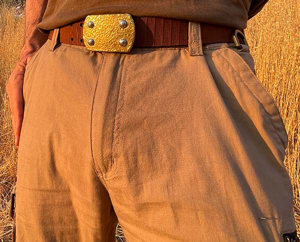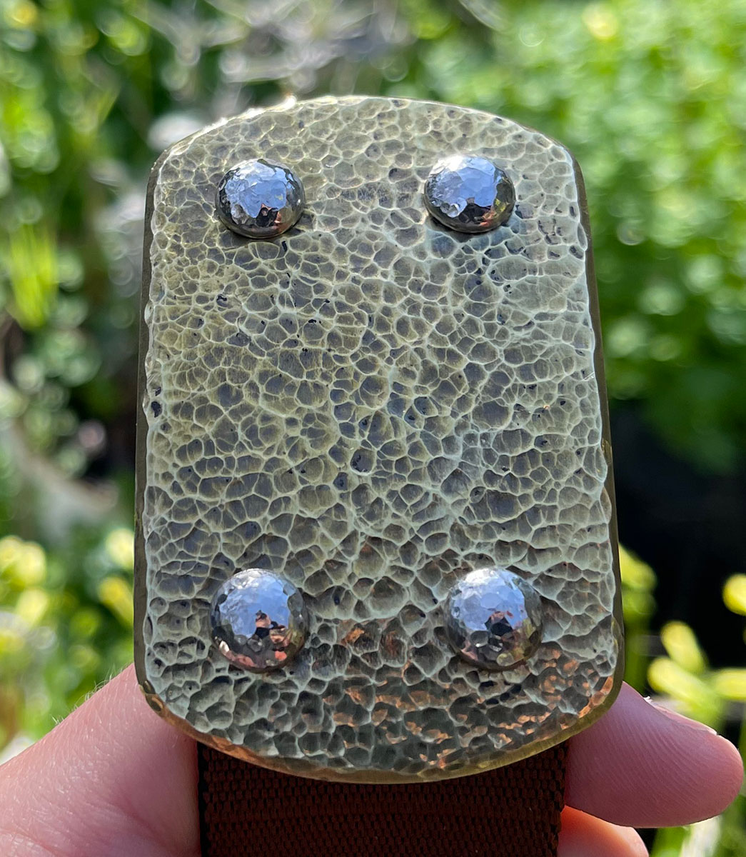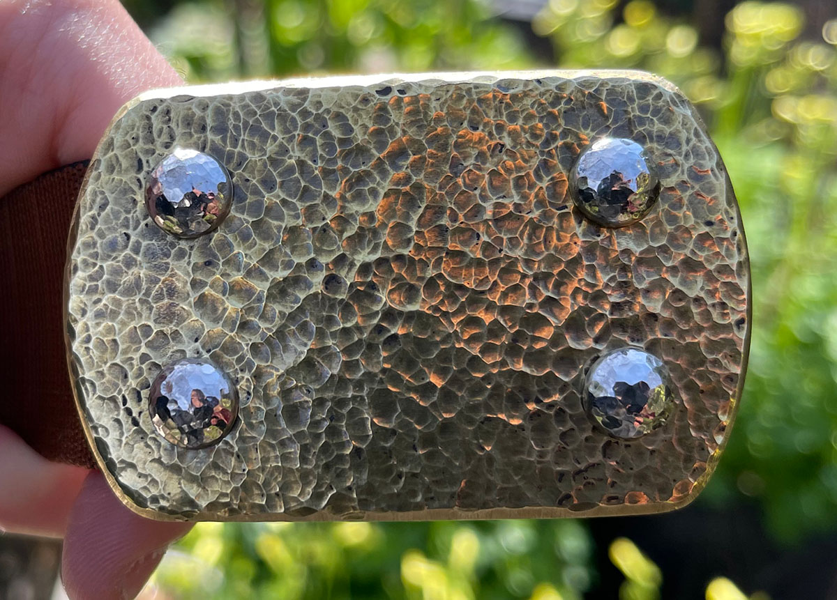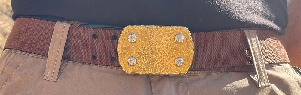 SIEGE Tsavo belt: 6.5 ounce solid Brass LARGE buckle with hammered and polished finish on front and sides, as well as bolt heads, with stainless steel bolts and prongs — bolted to custom 1.5″ high-density ballistic Nylon in the length you require, with either Black or Brown facing out.