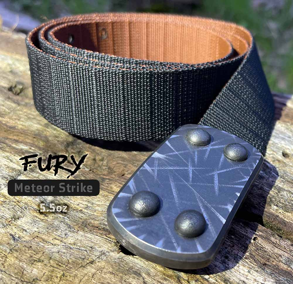 All of our stainless steel belts are equally tough, but for a “beater belt” that you plan to do a lot of target practice with, our most popular brushed (“Gray Man” finish) Fury, Ferocious, and Frenzy belts are the most scratch-resistant. Our belts are guaranteed for a lifetime of normal wear as a belt. While the buckles can withstand significant impact, for target practice one should avoid hard, rough objects such as rocks, which could mar the finish or potentially bend the prongs (to avoid this always swing the belt at targets with the face of the buckle leading, and avoid hard surfaces). The bolt and prong heads on the buckle face are designed to dig in and concentrate the impact. While we have never needed to repair a damaged buckle, should your prongs get bent or the buckle damaged or badly marred from impact, you can email us photos and we will evaluate the repair / refinishing options and let you know what the cost will be. We will relish the challenge of repairing our first damaged buckle! If, for some reason, it can’t be repaired in a reasonable amount of time, we will offer you a generous discount on a replacement belt. Replacement straps can also be ordered for a small fee, if needed.